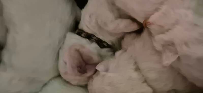 De neusjes van de pups beginnen al langzaam te kleuren. De eerste dagen na de geboorte zijn de neusjes en voetzooltjes rose, na een paar dagen kleuren ze zwart. Het werkt gewoon allemaal !