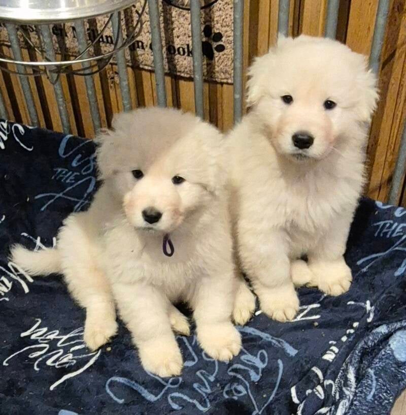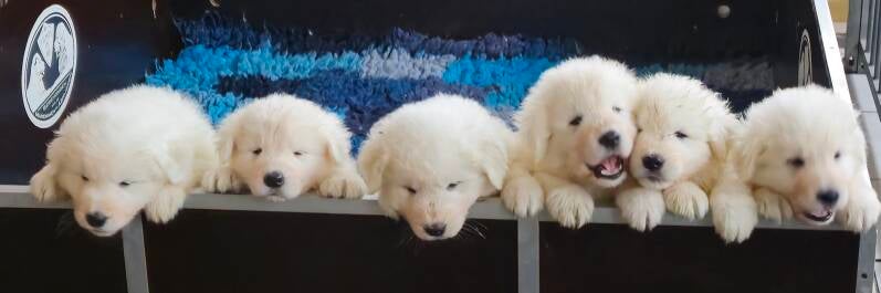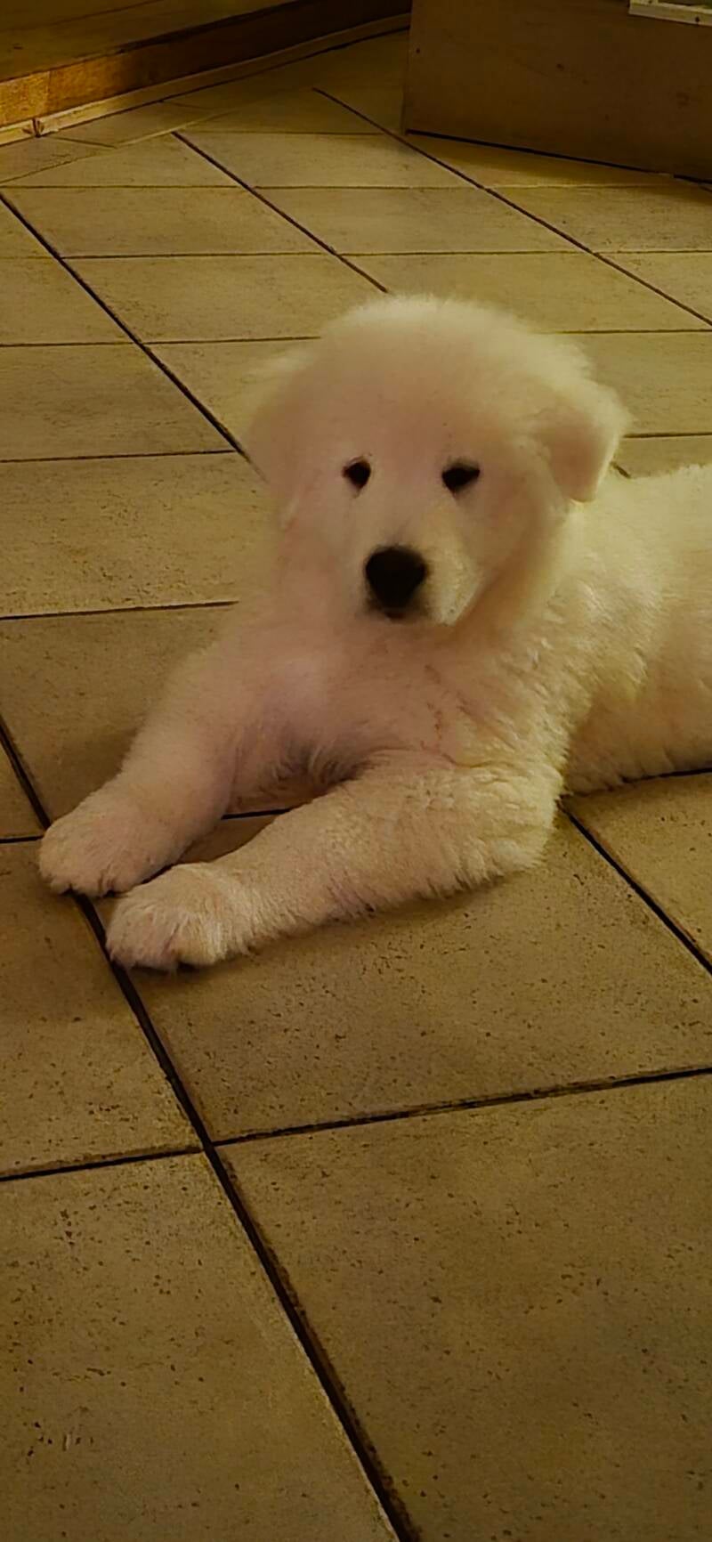 Inmiddels zijn ook pup nummer 2 en 3 vertrokken naar hun nieuwe huisje. Niva (pup paars) is afgereisd naar Emmeloord, waar ze bij Sandra en Marcel en hun meiden een fijn huisje krijgt. Xetoré (pup geel) is vandaag samen met Manuel en Ellen vertrokken naar Lummen in België, waar hij heerlijk kan spelen met collega-Maremma Senta.